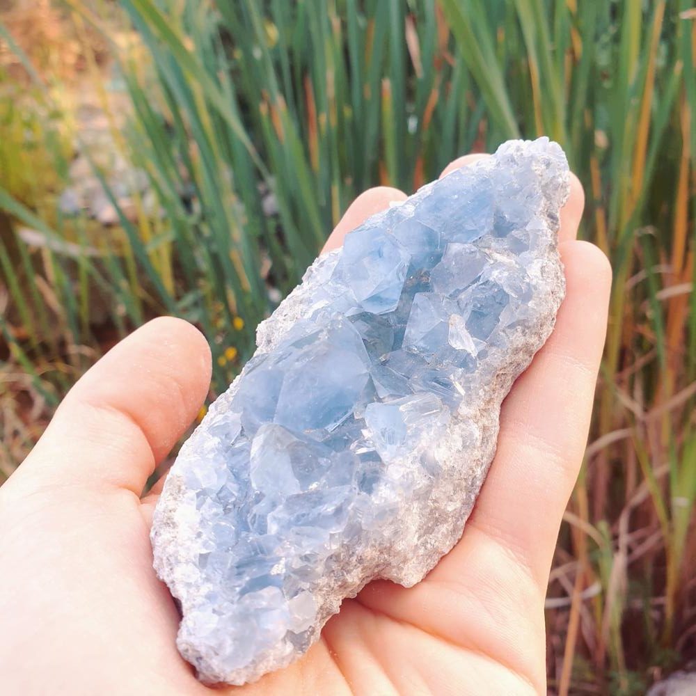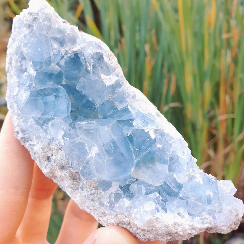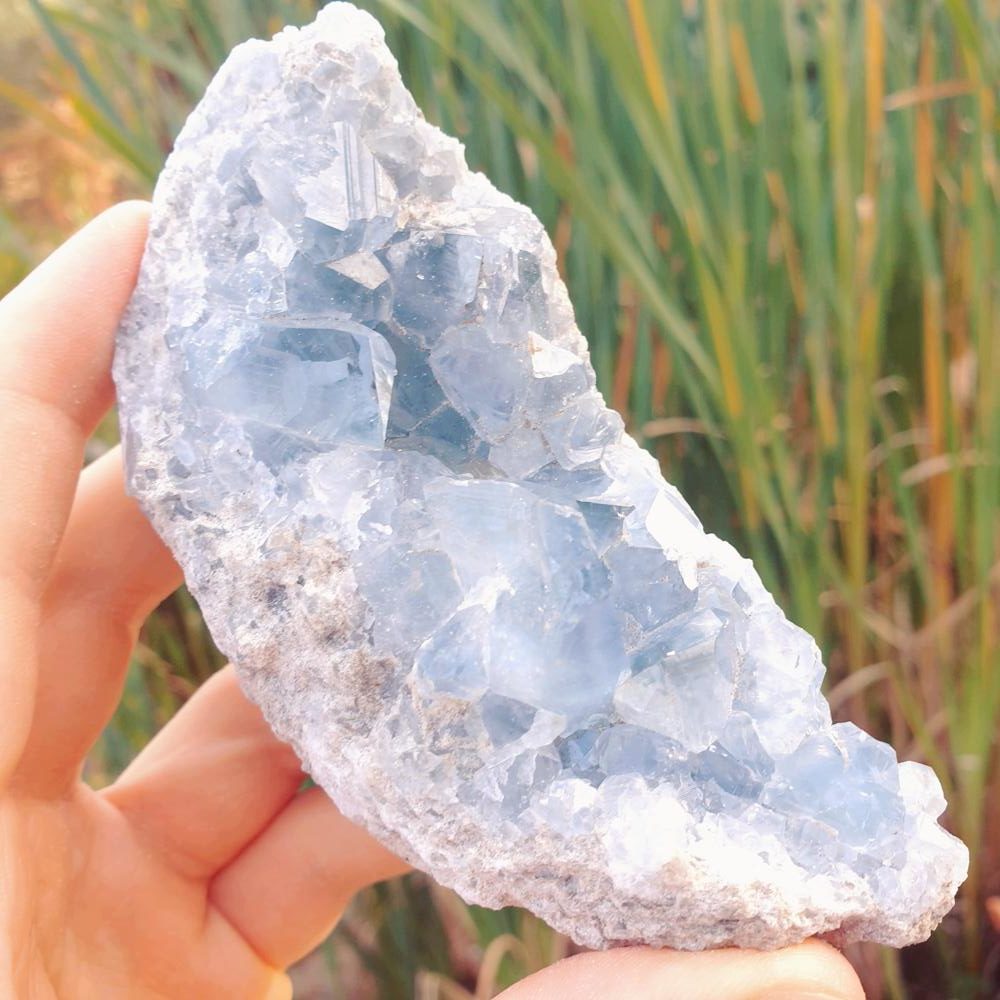 La Célestine ou Célestite est un minéral composé de sulfate de strontium. Elle fait partie du même groupe que la Baryte (ce sont des isomorphes).